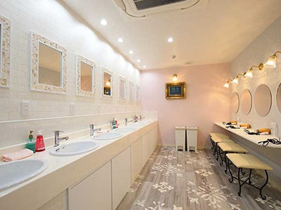 まるでお姫様気分♪高級ホテルの一室にいるような高級感溢れるオシャレなパウダールーム。広々とした洗面台やカウンタースペースがあり、最新美容器具やドライヤー、化粧水などご自由にお使いいただけます。